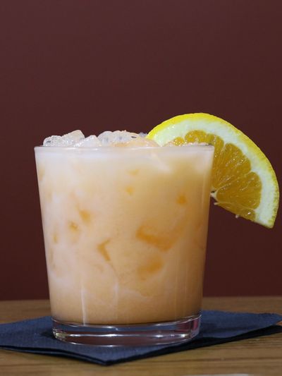 Shake to mix strain into rocks glass with ice top with orange soda garnish with orange wedge.